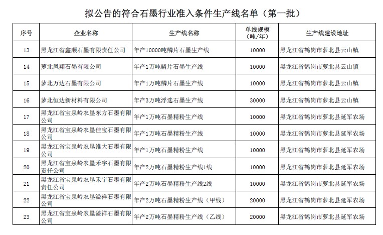 根據《石墨行業準入條件》和《石墨行業準入公告管理暫行辦法》,經企業申報、省級工業和信息化主管部門核實推薦和專家復核,現將擬公告的符合石墨行業準入條件生產線名單(第一批)予