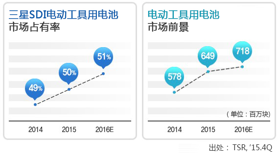 在電動工具市場,三星SDI的技術(shù)實力受到認可之后,TTi, Stanley Black & Decker, MAKITA等電動工具全球主流企業(yè)都向三星SDI的電動工具用電池伸出了橄欖枝。截止去年,向4大主流企業(yè)出售的電動工具用電池突破9億塊。如此驕人的成果,使得三星SDI成為電動工具用電池市場的第一。曾經(jīng)由日本企業(yè)占據(jù)的電動工具市場,現(xiàn)在三星SDI的占有率已經(jīng)達到50%。