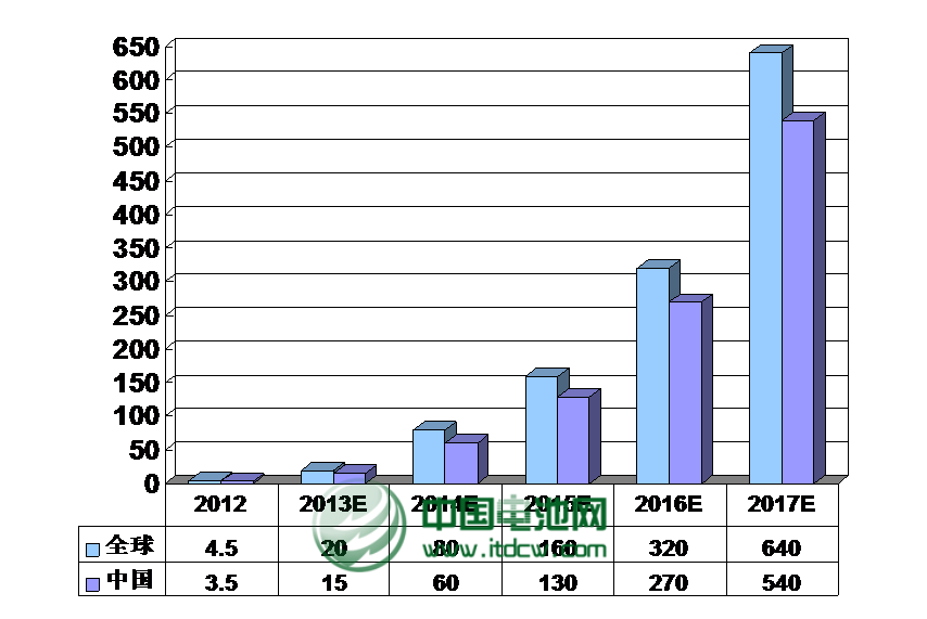 ② 真鋰研究預(yù)計(jì),2013年將會(huì)有15萬輛電動(dòng)三輪車使用鋰離子電池,而到2017年將會(huì)達(dá)到540萬輛,年均復(fù)合增長率將高達(dá)驚人的174.95%;