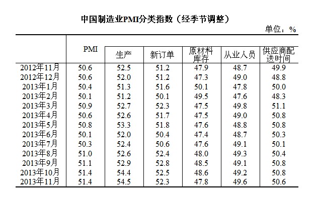 2013年11月,中國制造業采購經理指數(PMI)為51.4%,與上月持平,為2012年5月以來的高點,連續14個月位于臨界點以上,表明我國制造業繼續穩中向好。