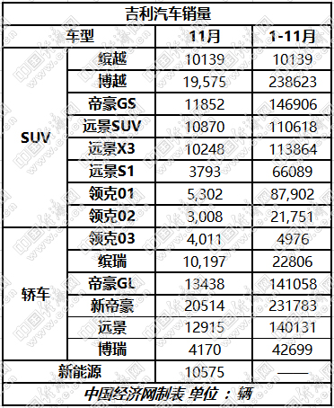 探索新領域合作 吉利增速走緩 相比之下,勢頭強勁的吉利汽車,在公布數據上則事無巨細。官方數據顯示,吉利汽車在11月份的銷量(含領克品牌汽車銷量
