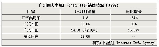 廣州汽車產(chǎn)業(yè)的今年的迅速回升還得歸功于廣州四大整車產(chǎn)業(yè)的迅速回升。今年前11個(gè)月,東風(fēng)日產(chǎn)(襄樊、鄭州也有生產(chǎn))2013年的累計(jì)銷量已達(dá)820,592輛,距離90萬(wàn)輛的年度銷量目標(biāo)僅剩8萬(wàn)輛不到,這一數(shù)字早已超過(guò)2012年全年77.3萬(wàn)輛的全年銷量,也超過(guò)未受到不良狀況影響的2011年的同期最高水平;廣汽本田1-11月累計(jì)銷量368,555輛,同比增長(zhǎng)30%;廣汽豐田前10月銷量同比增長(zhǎng)15.67%至24.31萬(wàn)輛;另外值得一提的是,廣汽乘用車前11個(gè)月的銷量已超7.2萬(wàn)輛,同比增幅達(dá)167%。