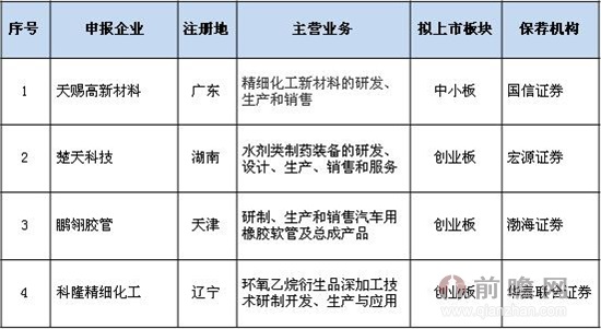 根據IPO咨詢機構前瞻投資顧問的不完全統計發現,在已通過發審會的83家企業中,有4家屬于新材料行業,包括廣州天賜高新材料、楚天科技、天津鵬翎膠管以及遼寧科隆精細化工。新材料屬于社會生產中的基礎性產業,其應用領域廣闊,涵蓋內容豐富,因此上市需求和活躍度也十分明顯。