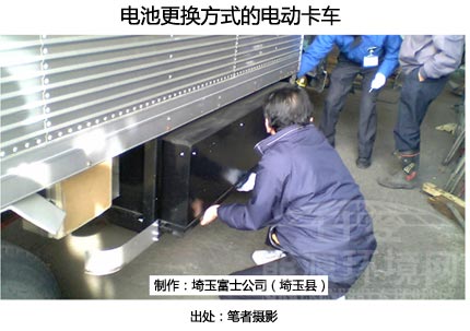 在日本,“改造電動汽車”領域進行著這種方式的嘗試。埼玉富士公司制作了采用電池更換方式的電動卡車(載重2噸),并于2011年6月8日通過了車檢。媒體對其改造作業的情形也進行了介紹。