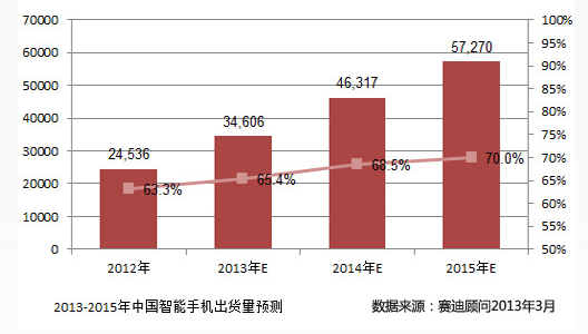 賽迪顧問預計,2015年中國市場智能手機出貨量將達到5.7億,預計未來國內廠商出貨量比重將保持上升,2015年將達到70%。3G網絡上網資費下調,運營商推出的“0元購機”策略,將成為智能手機出貨量增長的主要動力,運營商渠道未來將不斷擠占傳統手機銷售渠道。