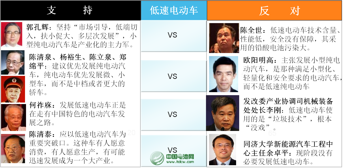 以郭孔輝院士為代表的支持者認為中國應當堅持“市場引導、低端切入、以小促大、多層次發(fā)展”的策略,優(yōu)先發(fā)展低速電動汽車來帶動新能源汽車發(fā)展。而以陳全世教授為代表的反對者則認為低速車技術(shù)含量低,安全沒保障,鉛酸電池污染大,更有部委官員明確表示低速電動車屬于“垃圾技術(shù)”,不適宜大規(guī)模發(fā)展。