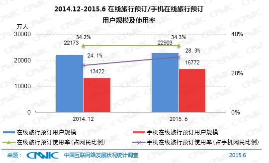 截至2015年6月,在網上預訂過機票、酒店、火車票或旅游度假產品的網民規模達到2.29億,較2014年底增長730萬人,半年度增長率為3.3%。在網上預訂火車票、機票、酒店和旅游度假產品的網民分別占比26.8%,13.3%,13.8%和6.2%。值得注意的是,網上預訂酒店的網民規模增長迅速,半年度增長772萬人,漲幅9.1%,對在線旅行預訂市場增長貢獻最大。與此同時,手機預訂機票、酒店、火車票或旅游度假產品的網民規模達到1.68億,較2014年12月底增長3350萬人,半年度增長率為25.0%,是整體在線旅行預訂市場增長速度的7.6倍。我國網民使用手機在線旅行預訂的比例由24.1%提升至28.3%。
