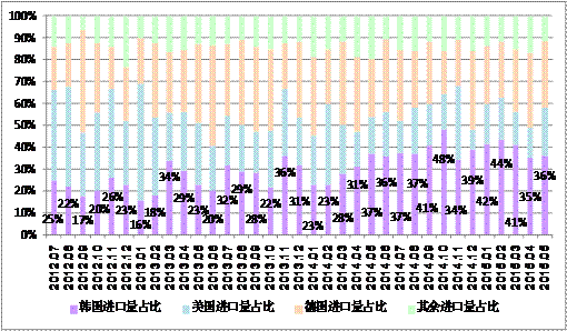 一是5月份從韓國進口多晶硅量達到4027噸,占當月總進口量的36.3%。1~5月份累計自韓國進口多晶硅19199噸,占累計總進口量的39.1%。韓國的主要出口企業OCI和韓國硅業(Hankook Silicon)的稅率僅為2.4%和2.8%,反傾銷稅對其根本不造成任何影響,故韓國在2014年5月超過美國和德國,一躍成為最大的進口來源地,已經連續一年保持首位。因此,自韓國進口量日漸攀升是導致進口量一再沖擊高點的主要原因。《中國-韓國自由貿易協定》于2015年6月1日在韓國首爾簽署,附件指出,若對韓國的制裁明顯存在主要企業稅率過低和反傾銷措施后傾銷加重的情況,在終裁執行滿一年之后,可以按反傾銷規則對韓國企業的稅率適用提起復審,同時執行加工貿易暫停政策,以保證反傾銷措施效果。因此,在符合法規的前提下重新審視對韓國反傾銷稅率勢在必行。