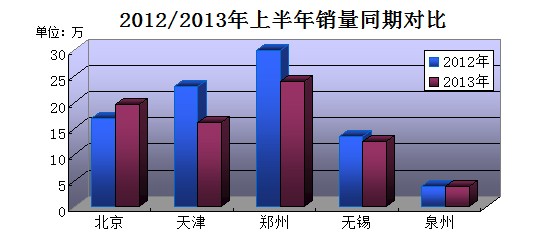 記者對北京、天津、鄭州、無錫、泉州五個城市經(jīng)銷商進行了抽樣調(diào)查,數(shù)據(jù)顯示,與2012年上半年銷量對比,除北京市場增長15%外,天津、鄭州、無錫、泉州四城市銷量均呈現(xiàn)不同程度的下降,其中天津下降幅度最大達30%,鄭州下降20%、無錫下降7%,泉州基本持平。