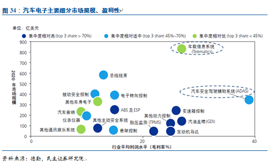 從汽車電子各細分行業(yè)的市場規(guī)模與盈利性來看,通訊娛樂系統(tǒng)與安全控制系統(tǒng)增長迅速:汽車安全駕駛輔助系統(tǒng)(ADAS)毛利率水平接近40%,2020年市場規(guī)模近400億美元;車載信息系統(tǒng)2020年市場規(guī)模超800億美元,是汽車電子細分行業(yè)中市場規(guī)模最大的。