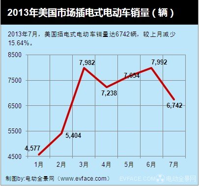 2013年,美國市場插電式電動車銷量從3月起連續(xù)4個月超過7千輛,7月份又跌落該數(shù)值,為6742輛,較上月減少15.64%,較去年同期增長123.99%。前7個月累計銷量為47589輛。