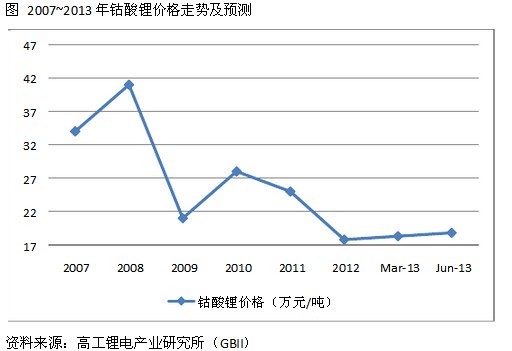 2008年以來(lái),鈷酸鋰價(jià)格持續(xù)下滑,從接近42萬(wàn)元/噸的高位持續(xù)回落到2012年年底的17.8萬(wàn)元/噸,其后在2013年一季度迎來(lái)“小陽(yáng)春”,價(jià)格稍微上漲到18.3萬(wàn)元/噸,二季度再接再厲,目前價(jià)格接近19萬(wàn)元/噸。(圖1)