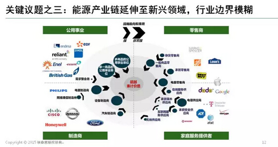 傳統(tǒng)的能源行業(yè)和新興產(chǎn)業(yè)互相滲透,共同角逐能源服務(wù)市場。例如,超市會進(jìn)入能源零售領(lǐng)域;電信供應(yīng)商、家電家居制造商和零售商,也會利用智能家居的產(chǎn)品和服務(wù)進(jìn)入能源服務(wù)領(lǐng)域;此外,高科技企業(yè)也在圍繞能源互聯(lián)網(wǎng)提供解決方案,甚至使電動汽車也成為移動儲能裝置。