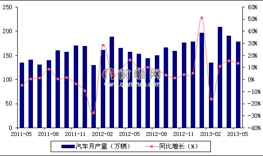 2011年5月-2013年5月我國汽車產(chǎn)量及同比增速(單位:萬輛,%)
