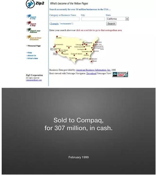 1999 年,康柏以 3.07 億美元收購了 ZIP2,也讓當時年僅 27 歲的 Musk 賺到了2200萬美金。