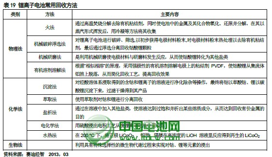 目前廢鋰離子電池的回收利用研究主要集中于電池中正極活性物質(zhì)的回收利用方法。一般來說,根據(jù)所采用的主要關(guān)鍵技術(shù),可以將廢鋰離子電池的資源化處理過程分為物理法、化學(xué)法和生物法這三類。