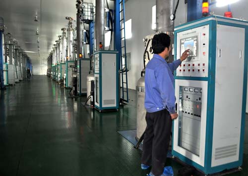 金塔萬晟光電公司拉棒車間內,工人正在查看儀器。