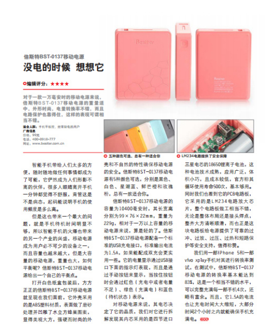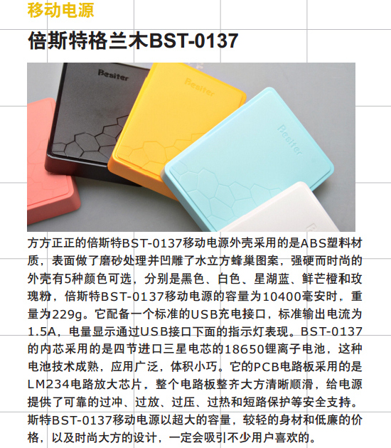 來自《電腦時(shí)空》的頒獎(jiǎng)詞:方方正正的倍斯特BST-0137移動(dòng)電源外殼采用的是ABS塑料材質(zhì),表面做了磨砂處理并凹雕了水立方蜂巢圖案,強(qiáng)硬而時(shí)尚的外殼有5種顏色可選,分別是黑色、白色、星湖藍(lán)、鮮芒橙和玫瑰粉,倍斯特BST-0137移動(dòng)電源的容量為10400毫安時(shí),重量為229g。它配備一個(gè)標(biāo)準(zhǔn)的USB充電接口,標(biāo)準(zhǔn)輸出電流為1.5A,電量顯示通過USB接口下面的指示燈表現(xiàn)。BST-0137的內(nèi)芯采用的是四節(jié)進(jìn)口三星電芯的18650鋰離子電池,這種電池技術(shù)成熟,應(yīng)用廣泛,體積小巧。它的PCB電路板采用的是LM234電路芯片,整個(gè)電路板整齊大方清晰順滑,給電源提供了可靠的過沖、過放、過壓、過熱和短路保護(hù)等安全支持。