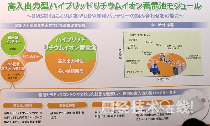 村田制作所認為,主要由容量和價格決定的鋰離子電池市場有望通過輸出功率和壽命方面的優勢進一步擴大。該公司瞄準的目標除了超小型交通工具以外,還包括代步車、無人搬送機、電梯、固定式蓄電系統、不間斷電源等。