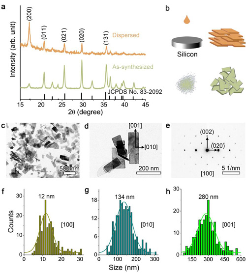 圖1(a)新合成的樣品和把樣品分散后再滴到非晶硅上的XRD圖譜。(b)圖a的示意圖。(c, d)LiFePO4的TEM圖。(e)對應(d)的電子衍射花樣。用高斯函數擬合LiFePO4晶粒沿著不同方向的尺寸統計數據。(f)a軸,12 nm,(g)b軸,134 nm,(h)c軸,280 nm。