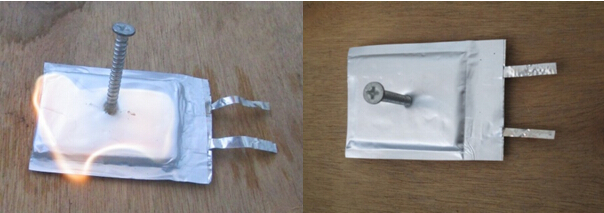 圖1 液態鋰電池(左圖)和全固態聚合物鋰電池(右圖)的滿電態穿刺安全性能測試