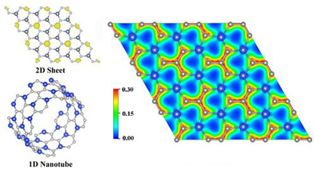 石墨烯是一種由碳原子構(gòu)成的單原子厚度二維薄膜新材料。由于其導熱系數(shù)高、電阻率極低、電子遷移速度極快,因此被期待用來發(fā)展新一代電子元件或晶體管,用來制造透明觸控屏幕、光板等。但是由于其半金屬特性(能隙為0 eV),并不適合做熱電材料和太陽能電池材料。為此,人們希望通過結(jié)構(gòu)調(diào)控和摻雜手段,增大石墨烯的能隙,從而拓展它們在光電器件中的應用。盡管碳基、硅基二維納米材料是當前的研究熱點,但具有適中能隙 (1–2eV),且能隙不依賴于手性或尺寸的材料尚未見報道。