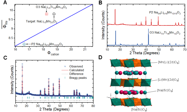 圖2.根據陽離子勢設計富鈉O3材料。(A)Na-Li-Mn(Ti)-O的陽離子勢分析;(B)初始組成Na[Li1/3Mn2/3]O2的XRD圖譜和相關標準圖譜;(C)O3-Na[Li1/3Ti1/6Mn1/2]O2的結構精修XRD圖譜;(D)[Li1/3Ti1/6Mn1/2]O2層中Li/Mn(Ti)有序排布的結構示意圖