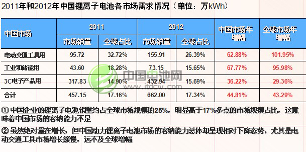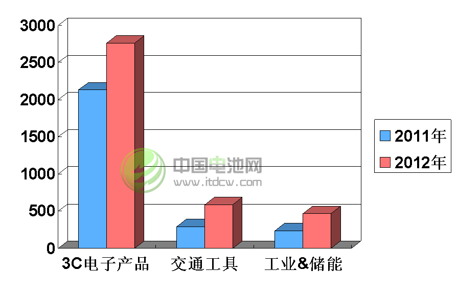 2012年全球動力鋰離子電池市場增長總量527.12萬kWh,雖然與3C小電池還有近100萬kWh的差距,但增長速度(近100%)遠(yuǎn)高于小電池(不到30%);交通工具各細(xì)分市場呈現(xiàn)全面增長態(tài)勢,工業(yè)&儲能市場目前還主要依賴電動工具,但智能電網(wǎng)儲能和移動基站電源市場增長很快。