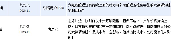 九九久:公司能消化碳酸鋰漲價(jià)影響