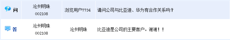 滄州明珠(002108)周二在全景網互動平臺上介紹稱,比亞迪是公司的主要客戶。