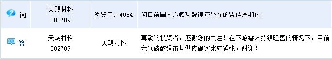 天賜材料(002709)周五在全景網互動平臺上表示,公司目前六氟磷酸鋰產能為2000t/a,暫無外銷。電解液產能約為2萬噸,目前訂單充足。天賜材料回答投資者提問時介紹,在下游需求持續(xù)旺盛的情況下,目前六氟磷酸鋰市場供應確實比較緊張。