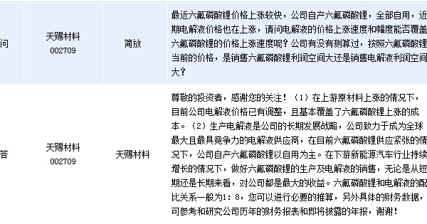 天賜材料(002709)周三晚間在全景網(wǎng)互動平臺上表示,在上游原材料上漲的情況下,目前公司電解液價格已有調(diào)整,且基本覆蓋了六氟磷酸鋰上漲的成本。