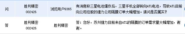 日前,有投資者在互動易向勝利精密求證:有消息稱三星電池爆炸后,三星手機全部轉向ATL電池,導致ATL向公司控股的捷力公司(預定的)隔膜訂單大幅增加。請問是否屬實?勝利精密22日回復證實:蘇州捷力目前來自ATL的隔膜訂單需求量大幅增加。