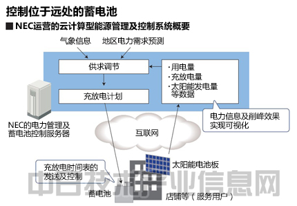 NEC公司開發出了使用信息通信技術遠程控制店鋪設置的蓄電池的系統。這是一種通過互聯網進行電力信息處理及控制的“云服務”,作為日本經濟產業省推進的“旨在通過IT融合創造新產業的研究開發事業”進行了開發。從2013年2月起,NEC與歐力士公司合作,通過分布在巖手縣、宮城縣和福島縣的實體店鋪,開始進行實證實驗。