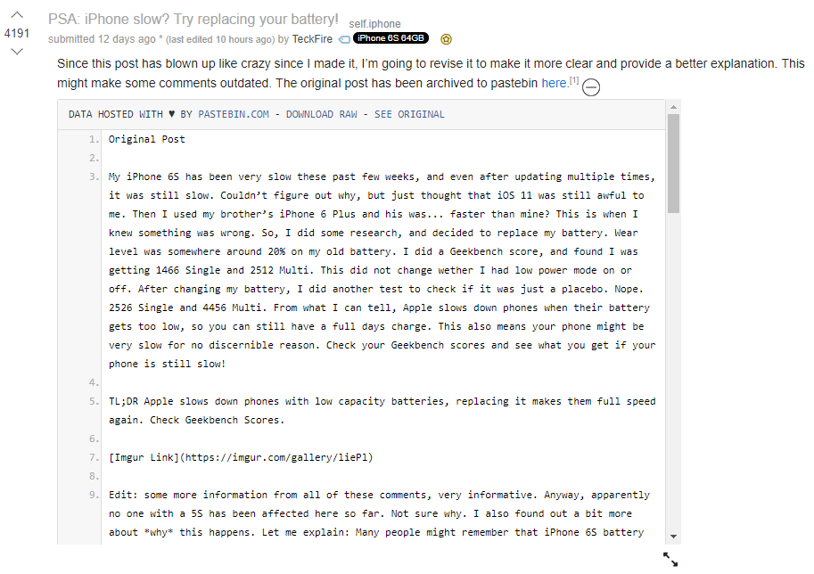 12月10日Reddit上一位用戶分享自行更換iPhone 6s電池后,處理性能回升70%作為開端,再到18日科技評(píng)測(cè)網(wǎng)站Geekbench創(chuàng)始人John Poole在博客上的數(shù)據(jù)檢測(cè)結(jié)果佐證了前者的結(jié)論,以前曾屢次被科技媒體和蘋果用戶提起的“陰謀論”再一次喧囂直上:蘋果公司可能通過刻意降低舊型號(hào)手機(jī)性能的方法,促使用戶“自發(fā)”地更換新型號(hào)手機(jī)以獲得更好的體驗(yàn)。