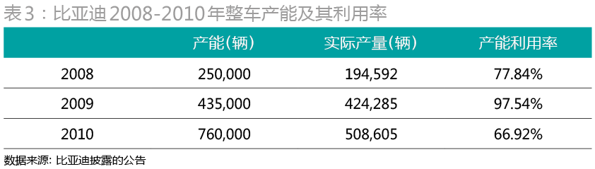2010年,基于2009年銷量的翻倍增長(zhǎng),自信的比亞迪開始了戰(zhàn)略性擴(kuò)張。當(dāng)年,比亞迪進(jìn)一步擴(kuò)張產(chǎn)能,在2009年的基礎(chǔ)上產(chǎn)能增長(zhǎng)75%,年產(chǎn)量提升至76萬輛(表3)。此時(shí),燃油汽車市場(chǎng)的瓶頸很快到來。隨著國(guó)家為應(yīng)對(duì)金融危機(jī)而推出的振興汽車行業(yè)的系列政策于2010年底結(jié)束,2011年的中國(guó)汽車市場(chǎng)增長(zhǎng)顯著放緩,其中部分月份的銷售情況甚至比前一年同期下跌。根據(jù)中國(guó)汽車工業(yè)協(xié)會(huì)的統(tǒng)計(jì)數(shù)據(jù),2011年汽車產(chǎn)銷量約為1842萬輛和1851萬輛,產(chǎn)銷量增速為近13年來最低。