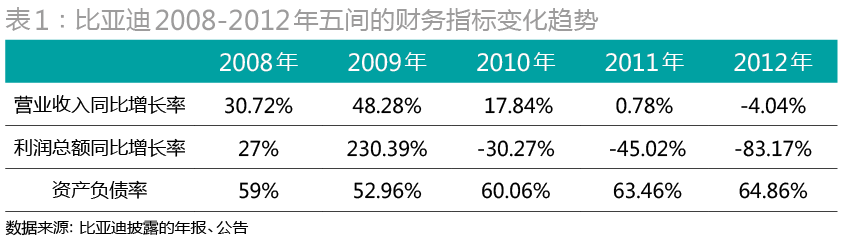 兵困汽車市場(chǎng),使比亞迪的經(jīng)營(yíng)陷入困局(表1)。2011年,比亞迪營(yíng)業(yè)收入僅同比增長(zhǎng)0.78%,營(yíng)業(yè)利潤(rùn)同比大幅下降49.04%,歸屬于上市公司股東的凈利潤(rùn)同比下降45.13%。資產(chǎn)收益率、每股收益創(chuàng)近三年新低,資產(chǎn)負(fù)債率攀升至近三年新高。2012年,由于汽車業(yè)務(wù)不景氣,加之手機(jī)代工業(yè)務(wù)也出現(xiàn)12.51%下滑,比亞迪當(dāng)年?duì)I業(yè)收入出現(xiàn)有史以來的負(fù)增長(zhǎng)(-4.04%)。