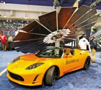 特斯拉電動汽車上裝著巨大的太陽能板 本版圖/新華社 豐田公司展示的氫燃料電池汽車FCV 豐田公司展示概念車i-road 一位觀眾用遙控器控制奔馳汽車內部屏幕 馬自達公司展示未來車用智能系統...