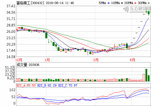 公司于2月29日開始停牌,6月1日終于復牌。復牌之后連續6個“一”字漲停,6月13日終于開板,雖然當日大盤暴跌3.21%,但富臨精工仍逆勢上漲3.18%。而公司股價已經從停牌前的收盤價19.20元一躍增至34.71元,短短7個交易日漲幅超80%,賺錢效應明顯。...