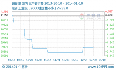 商品名稱 報價單位 報價類型 報價 發布時間 碳酸鋰 四川興晟鋰業有限責任公司 出廠價 39500元/噸 2014-01-16 碳酸鋰 江西東鵬新材料有限責任公司 出廠價 45000元/噸 2014-01-16 碳酸鋰 江西江鋰科技有...