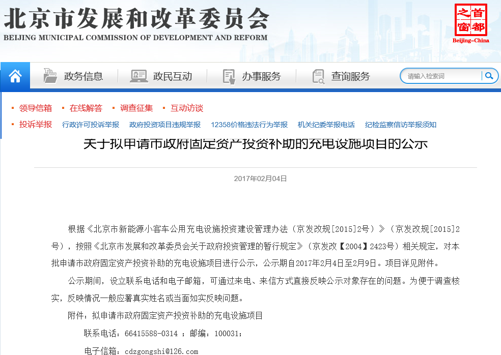 按照《北京市發(fā)展和改革委員會(huì)關(guān)于政府投資管理的暫行規(guī)定》(京發(fā)改【2004】2423號(hào))相關(guān)規(guī)定,對(duì)本批申請(qǐng)市政府固定資產(chǎn)投資補(bǔ)助的充電設(shè)施項(xiàng)目進(jìn)行公示,公示期自2017年2月4日至2月9日。...